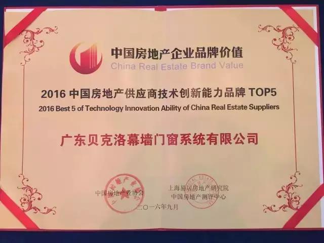 貝克洛憑借較好的技術(shù)和創(chuàng)新能力榮獲“2016中國房地產(chǎn)供應(yīng)商技術(shù)創(chuàng)新能力品牌TOP5”。
